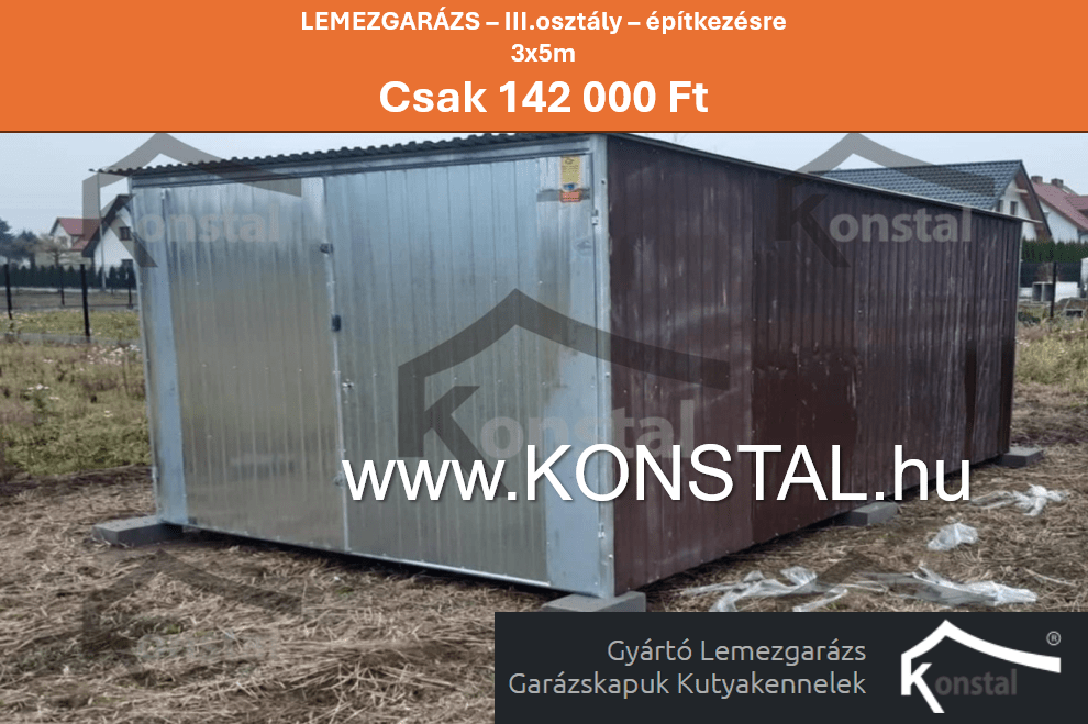 3×5 – 3. osztályú #lemezgarázs / ÉPÍTKÉSEKRE tökéletes . https://konstal-garazs.hu/…/3×5-3-osztalyu-lemezgarazs… Mobilgarázs, 3. osztályú lemezgarázs – ÉPÍTKÉSEKRE tökéletes, 3 m (2,97 m) széles x 5 m (4,97 m) hosszú , hátrafelé lejtős tetővel és kétszárnyú kapuval. A garázs szerkezete alapozó festékkel festett szögekből készült. A másodosztályú trapézlemez a szerkezethez van szegecselve (elszíneződések, karcolások, foltok, horpadások vannak, a lap többféle árnyalatú és színű lehet) alumínium szegecsekkel. Garázs garancia nélkül. A kész elemek csavarokkal vannak összecsavarozva, így kompakt és tartós szerkezet jön létre.